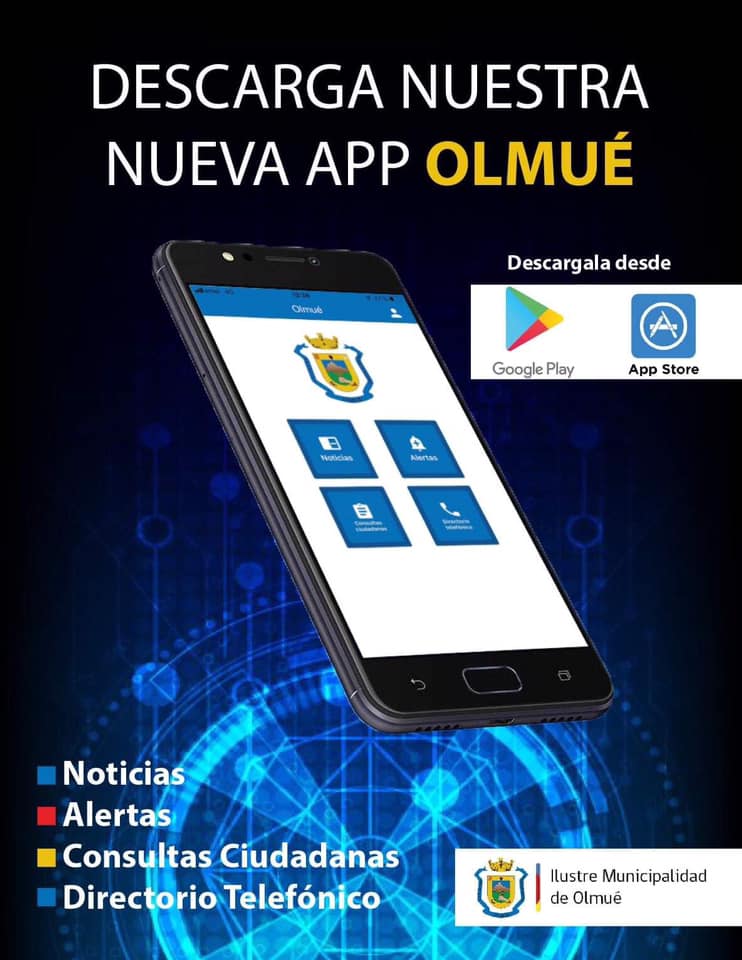 Se ha creado una nueva aplicación para que los vecinos usuarios puedan estar conectados con el municipio desde el teléfono celular, descargando la aplicación que se ha denominado "OLMUÉ" para equipos Android o smartphone desde App Store o Google Play aplicación (App) que es totalmente gratis.
